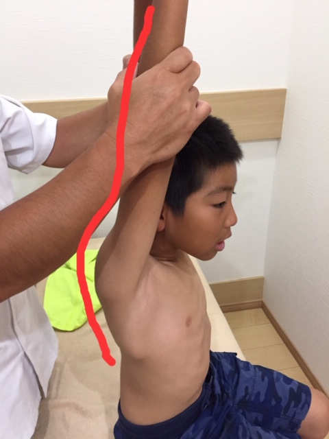 治療後は2枚目の写真のように腕もまっすぐに上がるようになり、肩の痛みも取れました。